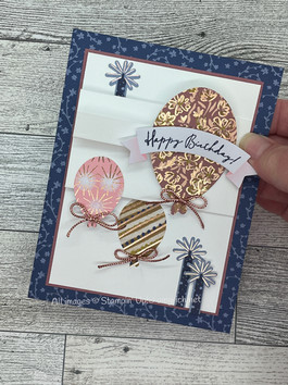 From the Time for Cake Paper Pumpkin kit, I used the three balloon die cuts (complete with metallic rose gold accents. Beautiful!), three candles (which I stamped using one of the candle dies from the stamp set), a banner on which I stamped the "Happy Birthday," the card base from one of the cards in the kit, and the rose gold metallic twine. We must not forget the stamps and stamp set with the little Night of Navy Stampin' Spot.