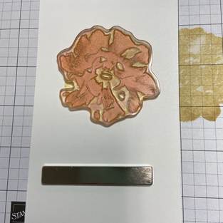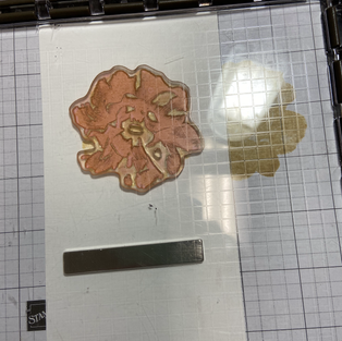 Next, place on the foam mat on the Stamparatus and lay the second step of the stamp exactly where you want it to stamp. Bring the acrylic plate down over the stamp so it attaches to the acrylic plate. Bring the plate up, ink the stamp with "full strength" So Saffron ink, and put it back down on your paper, as shown in the last of the three photos below.