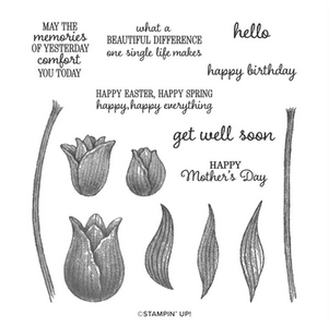 When I consider the Last Chance list (attached here) and all the items from it already gone, one stamp set did jump out at me to use on Wednesday was Timeless Tulips, along with the coordinating Tulip Builder Punch. They've been around for awhile, so I guess it's time for them to go. However, I do love the ease of this punch and the elegance of the stamp set. It creates such beautiful shading.