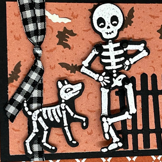I cut the first one down to 5 1/4" x 4" to layer on the front of the card. I decided on the focal point to be a skeleton and his dog and figured embossing the bones in white embossing powder on black cardstock would be most natural. I used the stamps and dies for the skeleton that has the body and limbs separate so I could attach them together with brads and have a pose-able image. Ack! So cute!